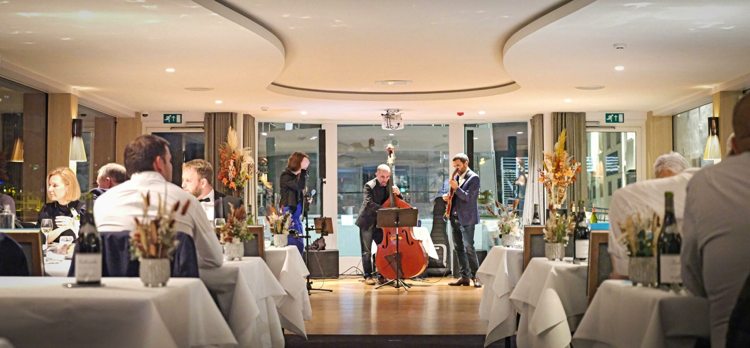 Un trio instrumental accompagne un apéritif ou un dîner dans un hôtel 5★, avec un swing élégant et un volume maîtrisé, en parfaite harmonie avec l’espace et la clientèle.